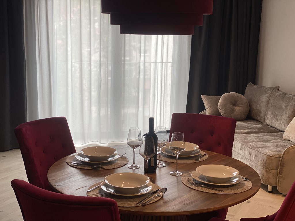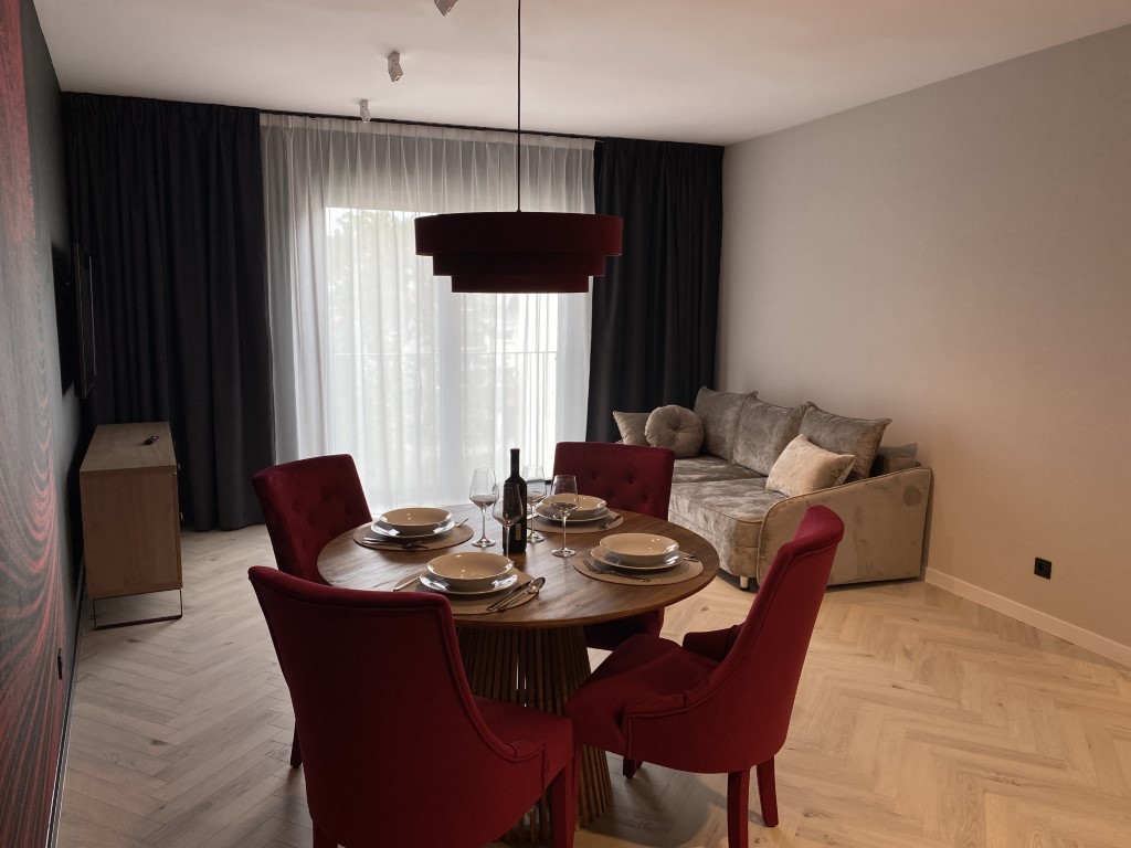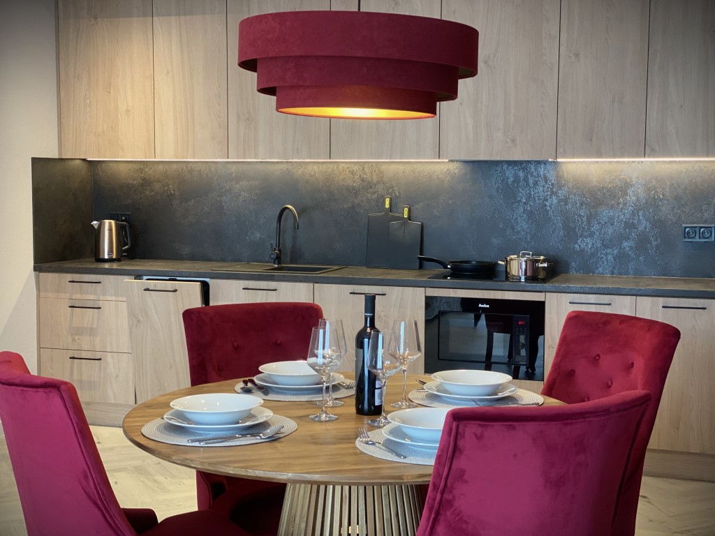 Stół z krzesłami, czajnik, kuchenka mikrofalowa, płyta indukcyjna, lodówka z zamrażarką, zmywarka, pralka, zestaw garnków i patelni, sztućce, szklanki, kieliszki.